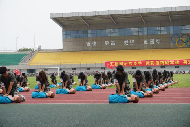 2025级新生军训期间,学校首次将全员应急救护“CPR+AED”培训全面纳入军训课程体系。作为军训期间的一项重要训练科目,并于军训汇报表演中首次设立“应急救护”特色方阵进行展示,充分体现了学校在国防教育与生命安全教育工作中的创新融合。