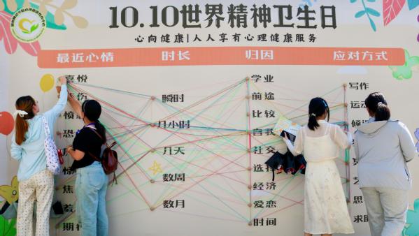 活动现场气氛热烈,精彩纷呈。本次活动涵盖“杏林医心”中医问诊、“情绪探索网”互动体验、“OH卡”愈心灵等多个环节,为师生的心理健康构建了全方位、多形式的支持平台。“杏林医心”中医问诊区前排起了长队,来自湖州市中医院的医师团队为师生提供现场健康咨询,生动展现了中医在情志调摄与身心共养方面的独特智慧;“情绪探索网”互动体验区成为当天备受青睐的亮点之一,同学们在专业引导下觉察情绪变化,学习情绪表达与管理的有效方法;“OH卡”愈心灵活动则以轻松有趣的方式揭开心理学神秘面纱,助力学生在自我探索中实现心灵疗愈。