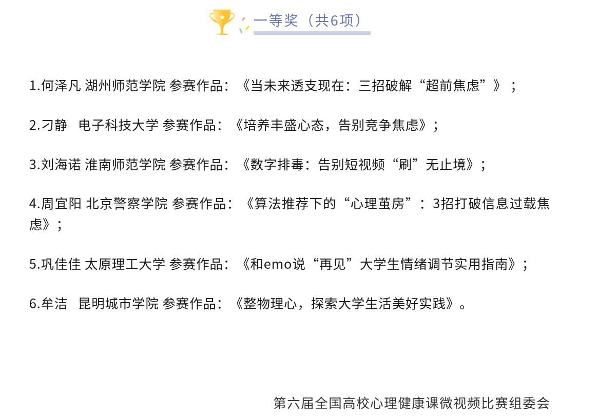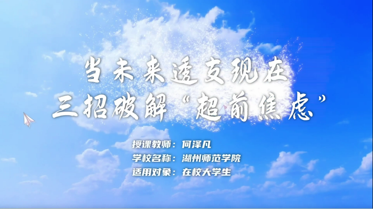 近日,第六届全国高校心理健康课微视频比赛结果正式揭晓,我校理学院何泽凡老师的参赛作品《当未来透支现在,三招破解“超前焦虑”》凭借鲜明的主题、创新的设计与实用的价值,从众多参赛作品中脱颖而出,荣获大赛一等奖!