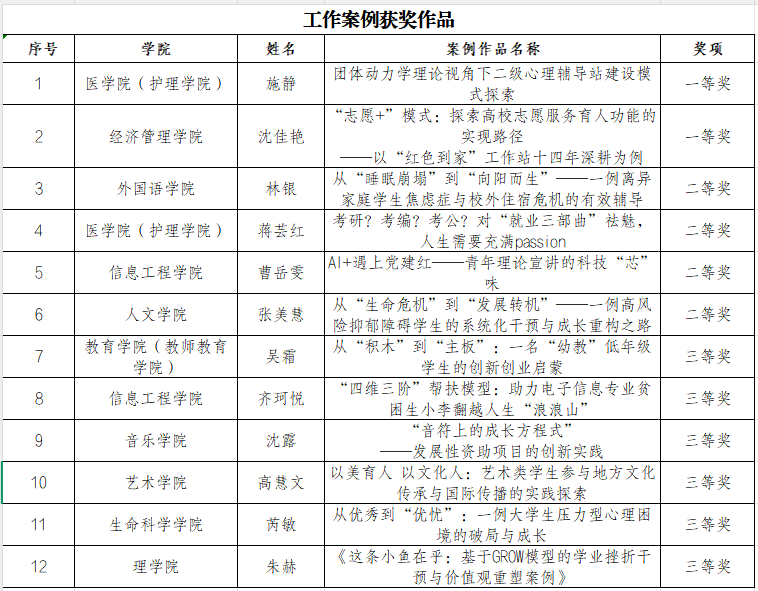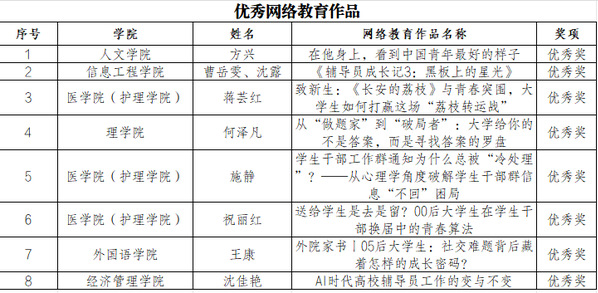 为进一步提升我校辅导员队伍的专业化、职业化水平,展示学生工作成效与网络育人成果,学生处组织开展了2025年度辅导员工作案例和网络教育优秀作品征集评选活动。本次活动得到了各学院和广大辅导员的积极响应与大力支持。经个人申报、专家评审等环节,共评选出优秀工作案例(个人案例)12篇,优秀网络教育作品8篇。现将获奖名单予以公布: