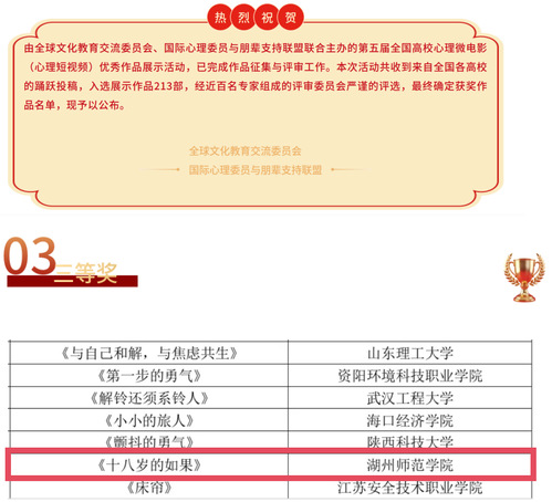 本次活动由全球文化教育交流委员会、国际心理委员与朋辈支持联盟联合主办,吸引了全国各高校踊跃参与,共征集到众多优质心理微电影作品,经过近百名专家组成的评审委员会严谨评选,最终 213 部作品入选展示。我校作品在激烈竞争中脱颖而出,充分展现了师生在心理题材创作领域的扎实功底与创新能力。